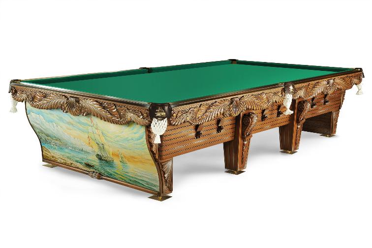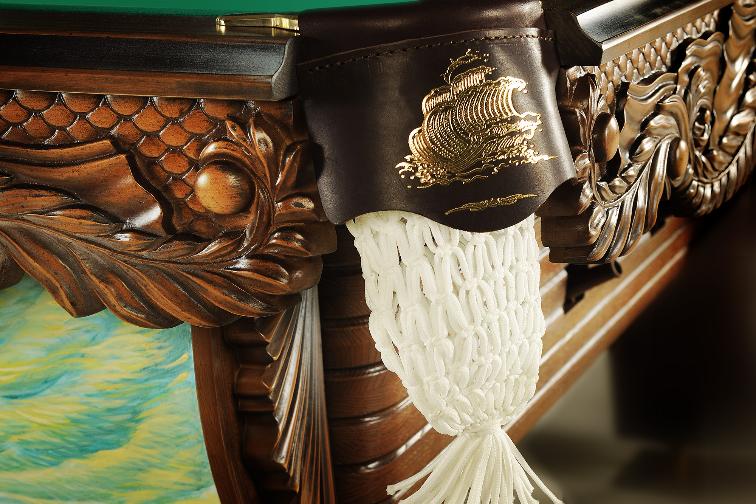 Бильярд «Морской» с массивной ручной резьбой по дереву и живописной росписью станет шедевром персональной бильярдной. Он придется по вкусу тем, кто влюблен в море, является поклонником высокой эстетики, изящества и роскоши.