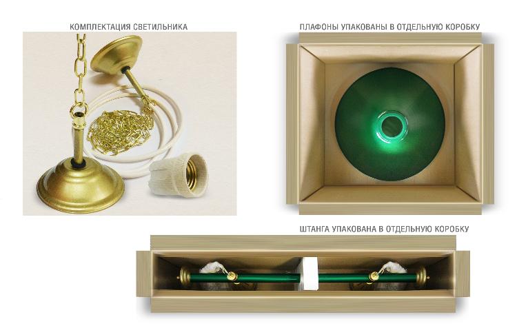 Укомплектованы цельной металлической штангой с полимерным покрытием. Штанга изготовлена из цельной трубы, что исключает искривление конструкции. Применение керамических патронов (Е27) увеличивает срок эксплуатации светильника. Металлические плафоны крепятся с помощью зажимных пластин. Длина подвесной цепи 100 см — оптимальное расстояние для расположения источника света над игровым полем стола. В комплект включены две потолочные чашки диаметром 10 см. Штанга и плафоны поставляются в отдельных упаковках.