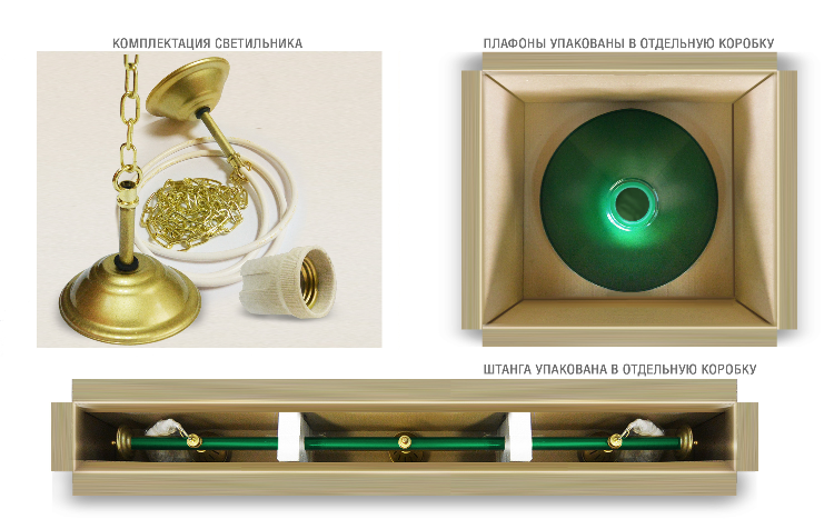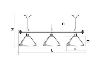Укомплектованы цельной металлической штангой с полимерным покрытием. Штанга изготовлена из цельной трубы, что исключает искривление конструкции. Применение керамических патронов (Е27) увеличивает срок эксплуатации светильника. Металлические плафоны крепятся с помощью зажимных пластин. Длина подвесной цепи 100 см — оптимальное расстояние для расположения источника света над игровым полем стола. В комплект включены две потолочные чашки диаметром 10 см. Штанга и плафоны поставляются в отдельных упаковках.