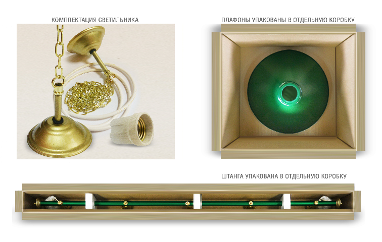 Укомплектованы цельной металлической штангой с полимерным покрытием. Штанга изготовлена из цельной трубы, что исключает искривление конструкции. Применение керамических патронов (Е27) увеличивает срок эксплуатации светильника. Металлические плафоны крепятся с помощью зажимных пластин. Длина подвесной цепи 100 см — оптимальное расстояние для расположения источника света над игровым полем стола. В комплект включены две потолочные чашки диаметром 10 см. Штанга и плафоны поставляются в отдельных упаковках.