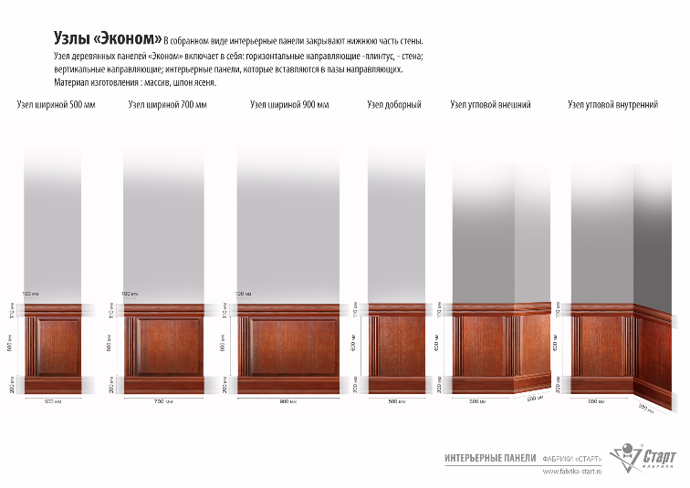 В собранном виде интерьерные панели закрывают нижнюю часть стены. Узел деревянных панелей «Эконом» включает в себя: горизонтальные направляющие -плинтус, - стена; вертикальные направляющие; интерьерные панели, которые вставляются в пазы направляющих.