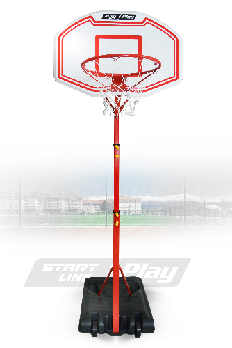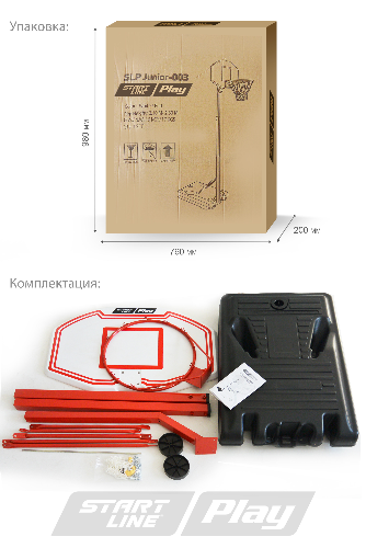 Мобильная баскетбольная стойка SLP Junior-003 от Start Line Play включает в себя полую базу, которая должна быть заполнена для утяжеления (рекомендуется песком), регулируемый по высоте щит, баскетбольную корзину. Высота стойки регулируется в зависимости от роста игроков.