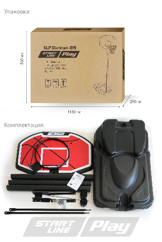 Мобильная баскетбольная стойка SLP Standard-019 от Start Line Play включает в себя полую базу, которая должна быть заполнена для утяжеления (рекомендуется песком), регулируемый по высоте щит, баскетбольную корзину. Высота стойки регулируется в зависимости от роста игроков.