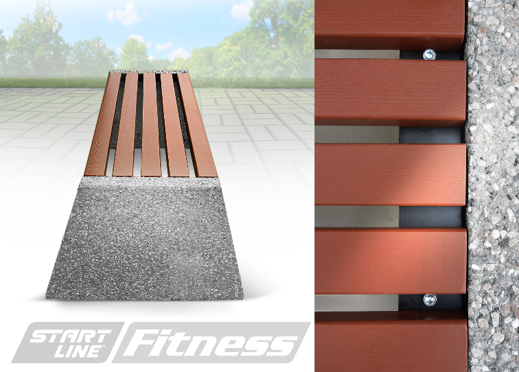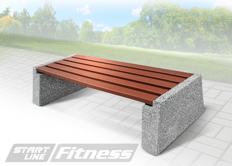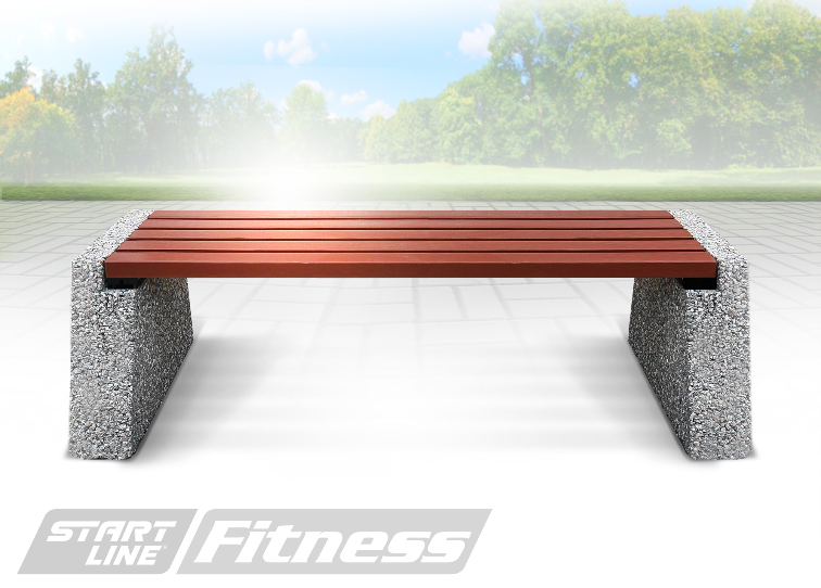 Решетка сиденья визуально облегчает конструкцию опор, создавая привлекательный внешний вид. Фактура камня и гладкая поверхность деревянных реек гармонично смотрятся на природном ландшафте.